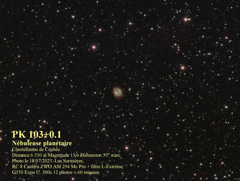 Elle mesurait 60 sec/arc. sa magnitude est de 14.69. Sa couleur bleutée vient du rayonnement des gaz Oiii (oxygène) . Il semblerait qu'il y ait des traces d'une coquille autour de cette nébuleuse, des résidus et des traces OIII sont perceptibles sur le côté gauche et formerait une bulle excentrée d'environ 2 à 3 min/arc. Une heure d'acquisition est beaucoup trop courte pour révéler ces traces Oiii sur ce fond Ha. N'ayant pas trouvé de données suffisantes sur cette nébuleuse planétaire, le fait qu'il y aurait une coquille externe n'est que pure hypothèse de ma part. Le 27 juin 2025 j'ai rajouté du temps,5 heures en tout.